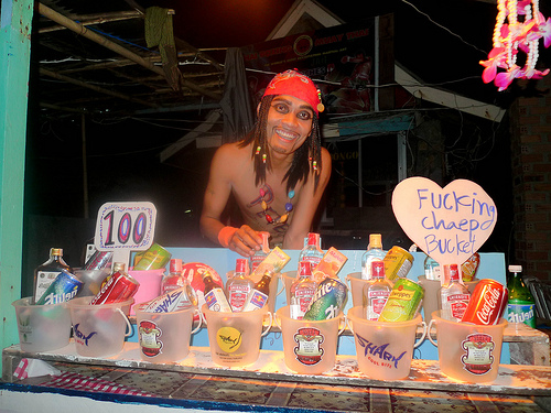 The chosen drink of the night is almost invariably a ‘bucket’ consisting of a ‘mickey’ of either whisky, vodka or sugarcane rum, a bottle of Red Bull and ice, sold along with a handful of straws so that friends (and sometimes complete strangers) can share. Noisy vendors line the streets and the beach, selling these colourful and cheap creations.